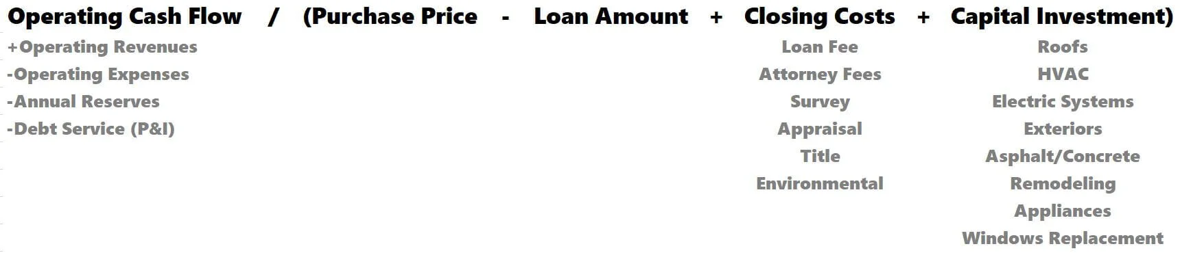 Operating Cash Flow / (Purchase Price - Loan Amount + Closing/Loan Costs + Capital Investment )