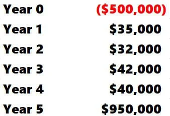 In this example, the cash flows' aggregate total in Years 1 - 5 would be added and divided by $500,000.