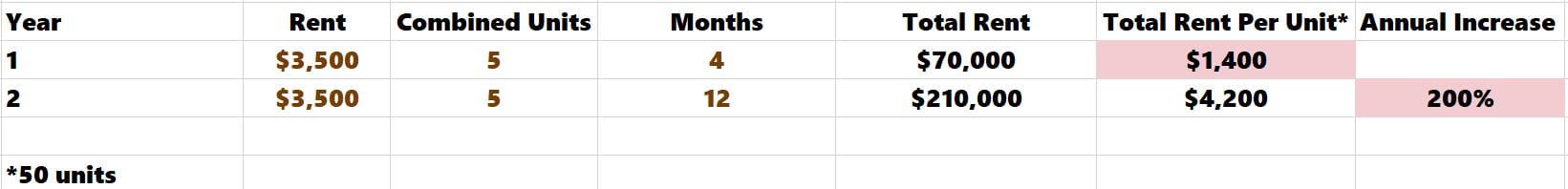 The units are combined in Year 1, and the duration is one year. The new 3BR rents are fully phased in by Year 2.