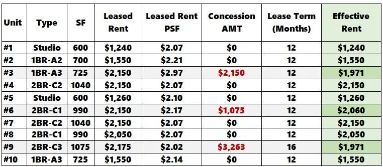 For units that received rental concessions (units #3, #6, and #9), we’d need to calculate the true effective rent,