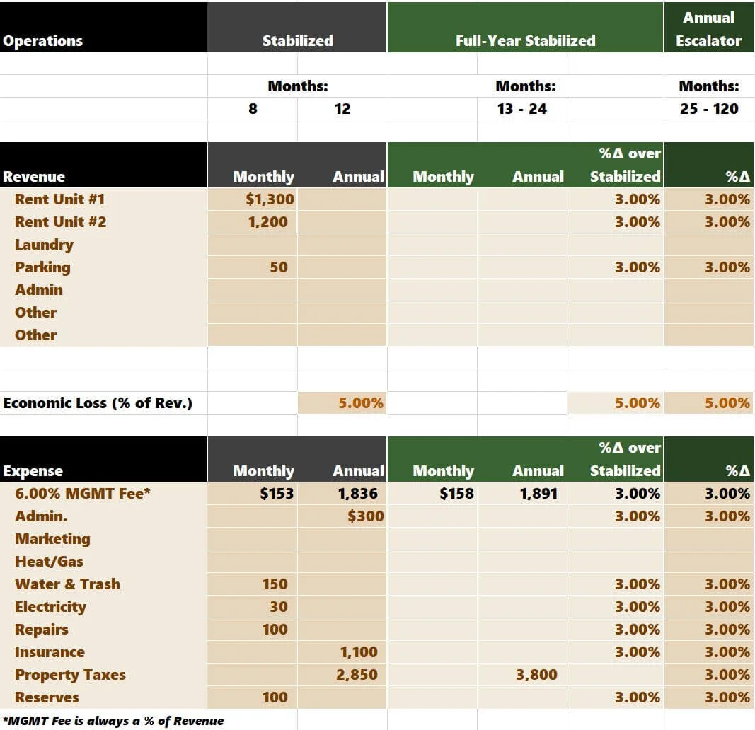 What will you be able to rent the unit(s) for, and what do you project stabilized assumptions to be (grey column)? What do you project the annual escalator to be each year for both revenue and expenses (green columns)?