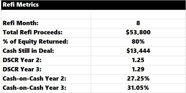 The ARV amount will determine the refinance proceeds. How much do you expect the property to appreciate annually post ARV? You can see below that I am assuming a modest 1%.