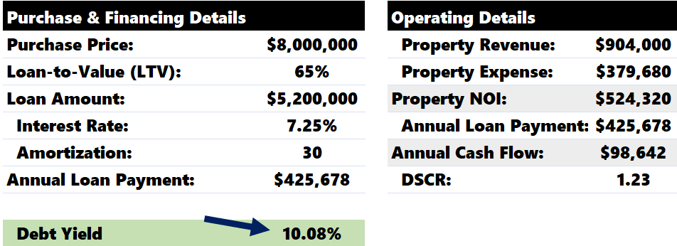 A higher debt yield means the lender would get paid back sooner. When we calculate the debt yield in our sample scenario, we get 10.08%.