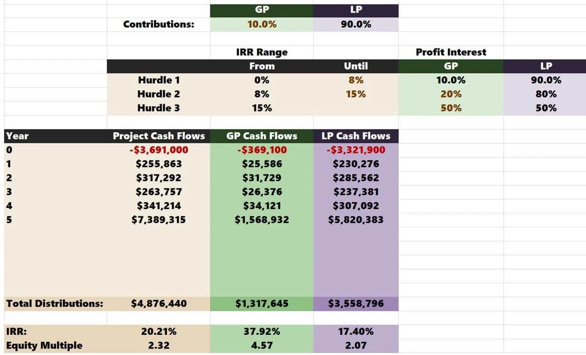 I like to think the IRR distribution model we use in Tactica Underwriting Models is “bare-bones” and easy to digest. If you ever utilize our version to pitch deals to partners or investors, it is paramount that you define the specifics. We prepared something sensible and fair for GP and LP with straightforward functionality.