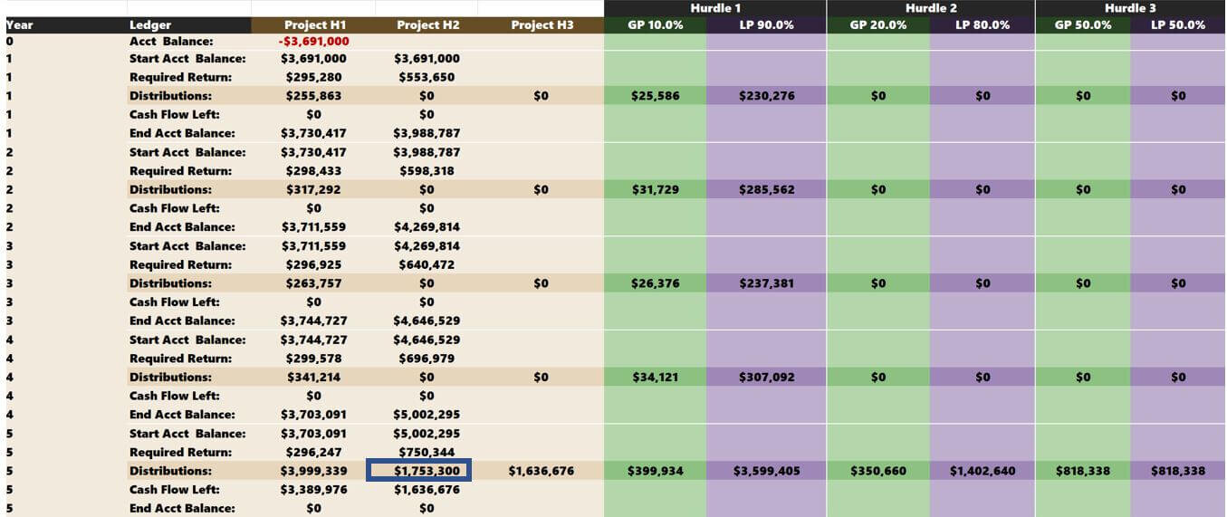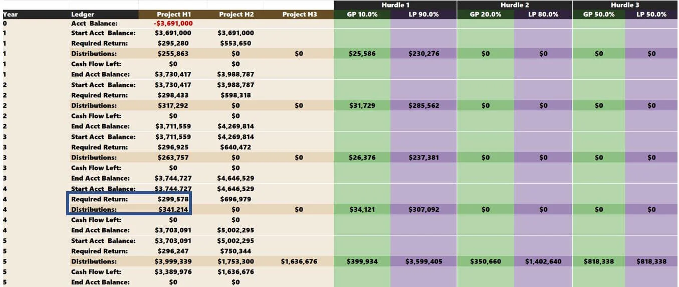 The same thing is happening in the “Project H2” column. The only difference is that the distribution is being calculated by taking the starting balance plus the required return minus what was already paid out in Hurdle 1