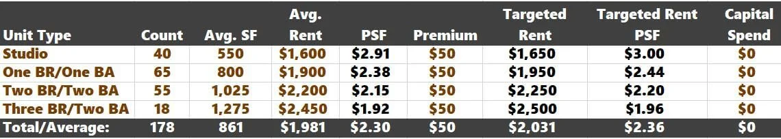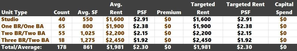 Many new units are coming online, and there may be opportunities to purchase apartment complexes built within the last decade that are less maintenance and labor-intensive. If you’re ever kicking tires on a newer turnkey property, the process is very similar to the value-add underwriting except for the unit mix assumptions we discussed above.