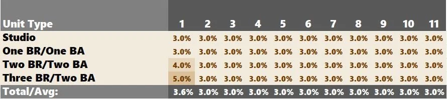 There may be an opportunity to increase the larger floor plans (three and two-bedroom apartments) more than the smaller, one-bedroom units in this example.