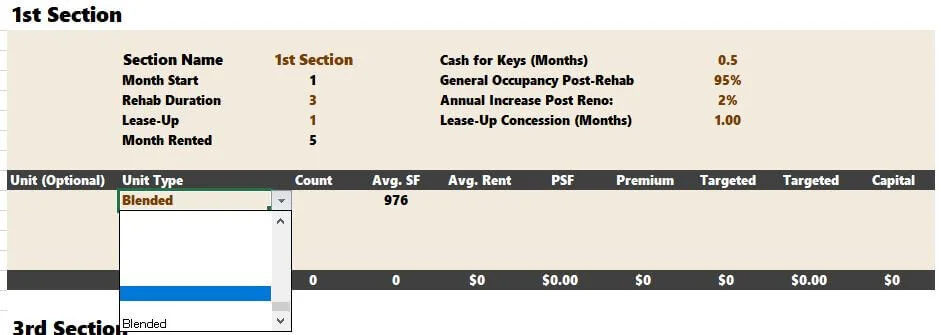 The renovation timing is set up for each section in the blue boxes. The “Month Start” is a formula that you can overwrite. The formula looks at when the previous section wraps up construction and will immediately begin the following month—Rehab Duration = three months.