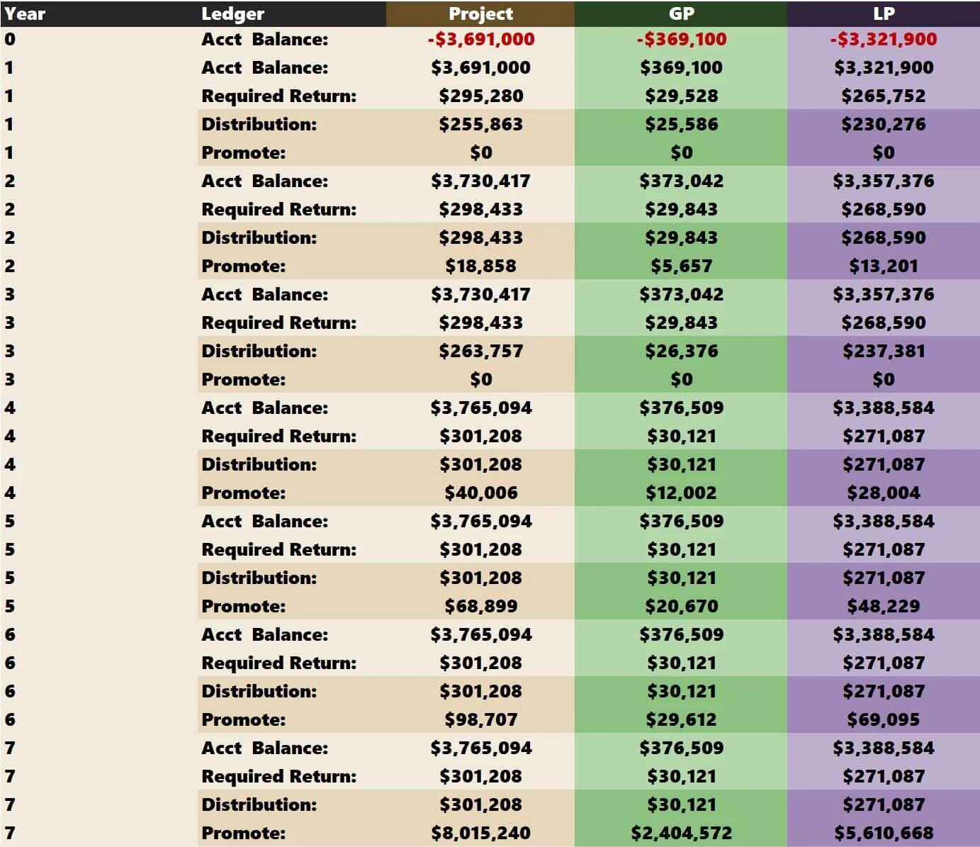 Notice that the Hurdle 2 Threshold is 100%, which I intend to be unobtainable. Any distributions over the preferred return of 8% will pay down the LP investor's capital account instead of flowing to the GP. The GP will only see 30% of the distribution after the LP: