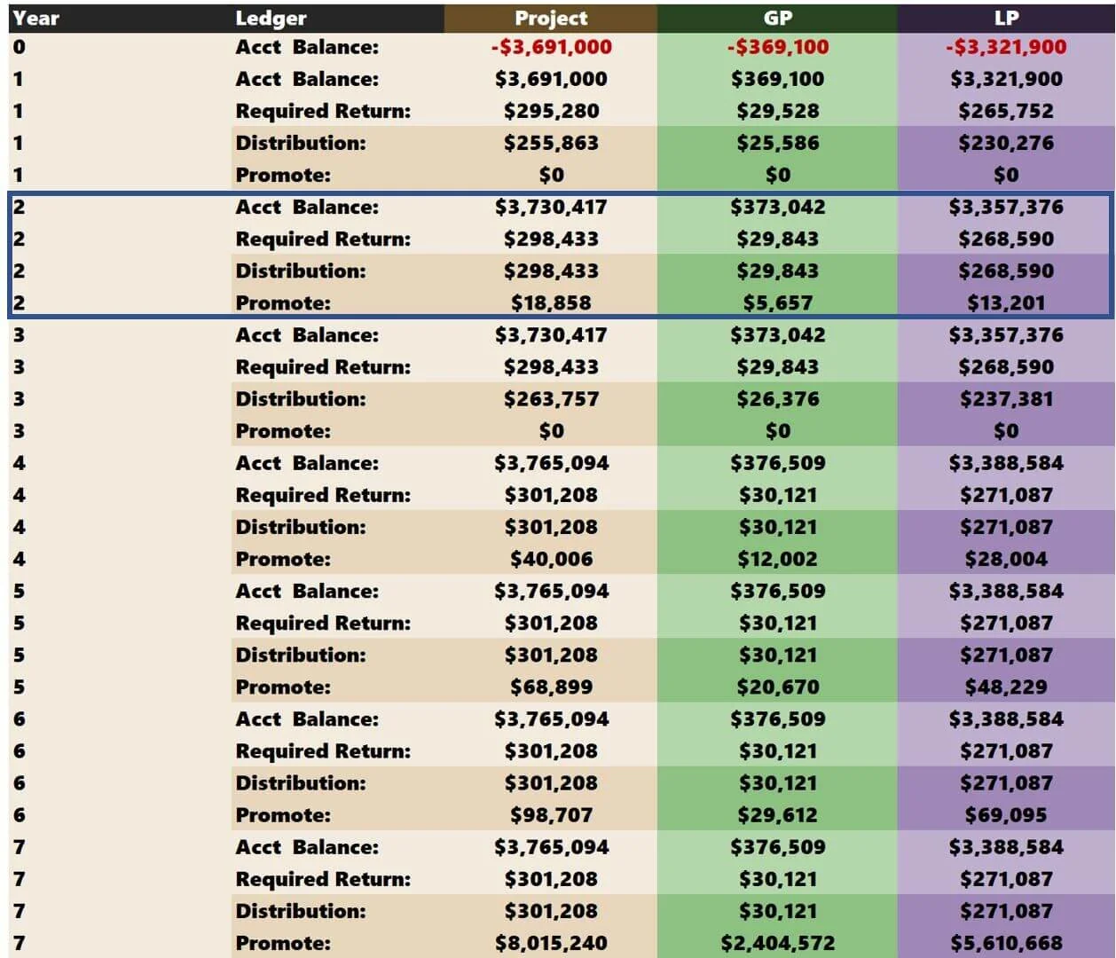 Caution: Distributions above the 8% preferred return are not utilized as a return of capital. The GP will see a more significant share of the profits before the LP is paid back in full. There are no lookback provisions or claw-back stipulations. Theoretically, the investment could cash flow a ton, pay the GP outsized returns, then sell for a loss and lose money. The GP would have no obligation to make the LP whole. The promotion is determined year-by-year and is not dependent on past or future years. Check out the “Trifold Alignment Tactic” to learn of a distribution structure more neutral between GPs/LPs with more emphasis on long-term investment success.
