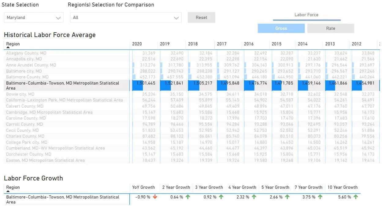 Period-over-period growth/decline. You have complete control over the period you want to be calculated for the metrics presented on the bottom section of this page. The increase or decrease in population, labor force population, and gross unemployment is calculated as "period-over-period" for the custom date range you select via the slider.