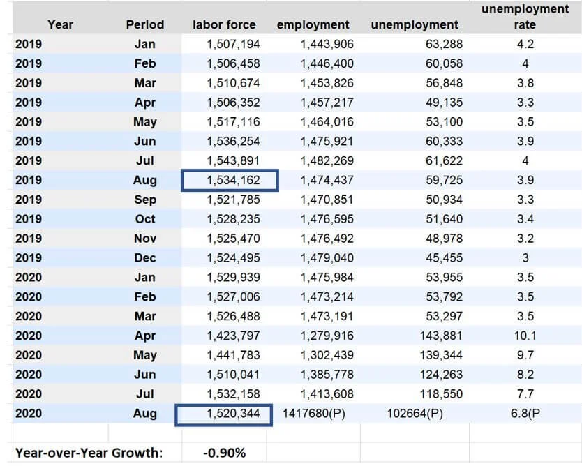 The 2020 average labor force is calculated the same, albeit there is not a full year of data yet.