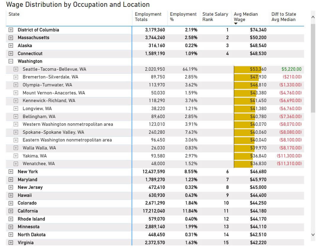 Drilling down even further, you will see occupation data at the regional level. Let's look at Seattle.