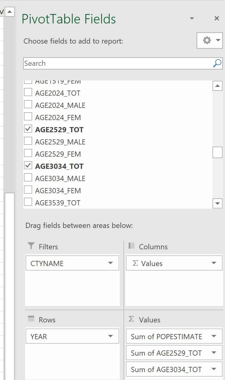 The population will be summarized each year in the pivot table. The gross population number is helpful, but I want to see this as a year-over-year (YOY) increase/decrease. We will again add "PopEstimate" to the "Value" section to do this. Click the little down arrow on the right and select “Value Field Settings.”