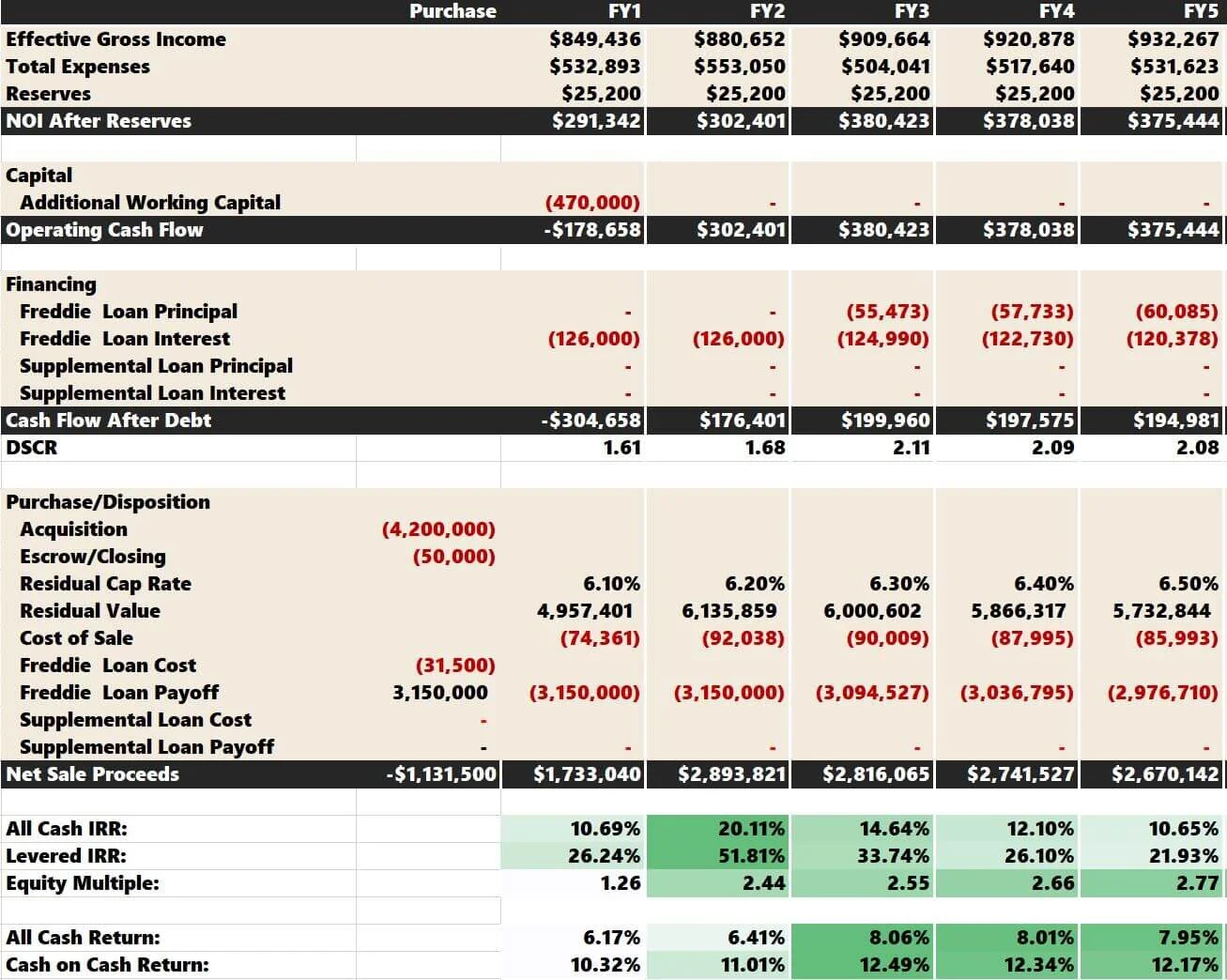 You can see that the model automatically factors in the $5,000 per unit in the "Renovation Capital" cell of -$420,000. A $4,200,000 purchase price with a 5-year hold period would look like the following.